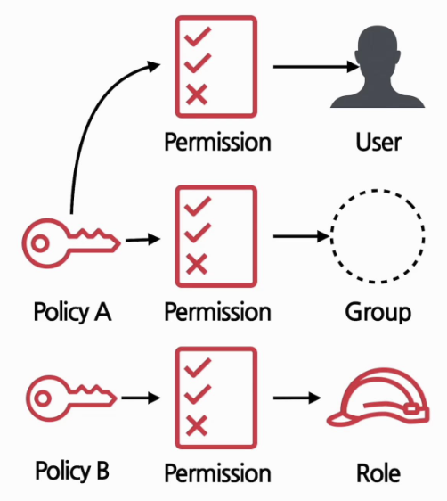 - Policy: 특정 AWS 리소스에 대한 액세스 권한을 정의하는 규칙, 권한을 정의하는 JSON 문서, 그룹 또는 역할에 연결되어 어떤 리소스에 대해 어떤 작업이 허용되거나 거부되는지 지정한다.